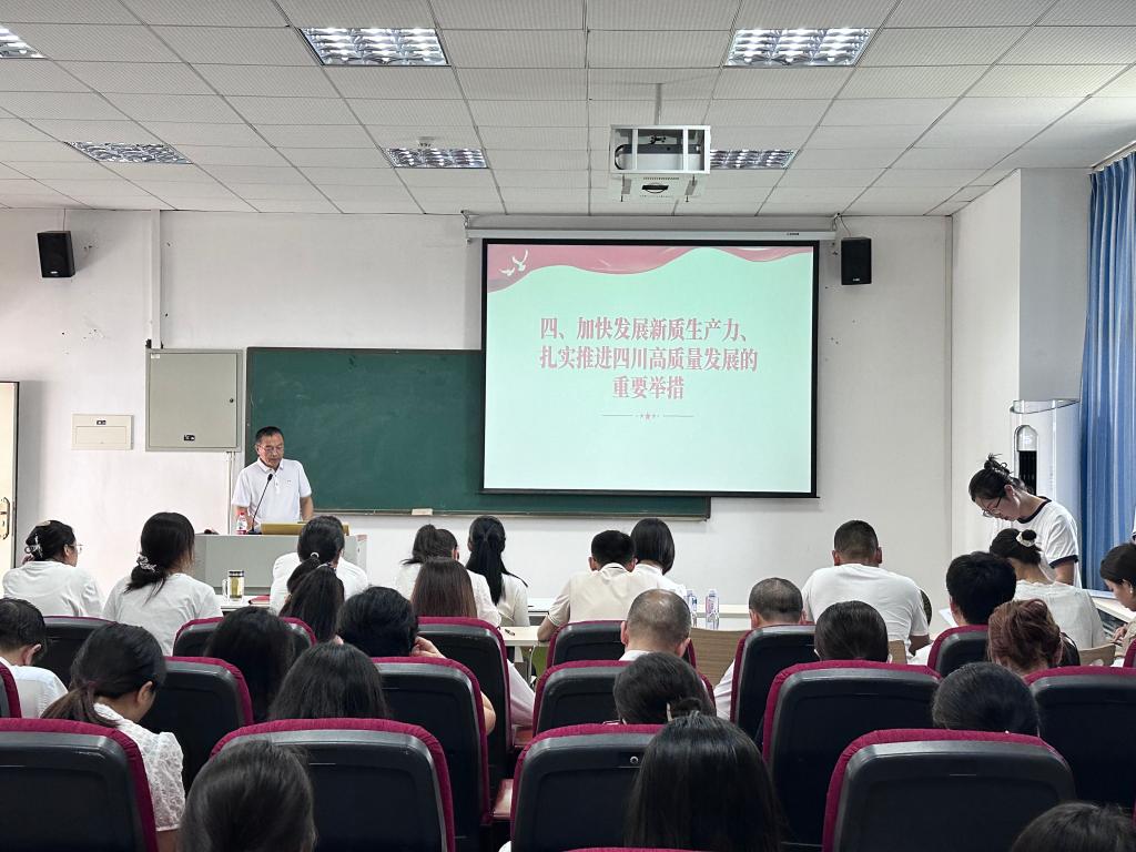 会上,赵钦同志带领全体师生党员共同学习了省委十二届五次全会精神。他围绕新时代治蜀兴川各项事业取得的新进展,加快发展新质生产力、扎实推进高质量发展的重大意义、总体要求、具体目标、主要任务和着力重点等内容,联系学校实际,进行了深入透彻、生动鲜活的宣讲。